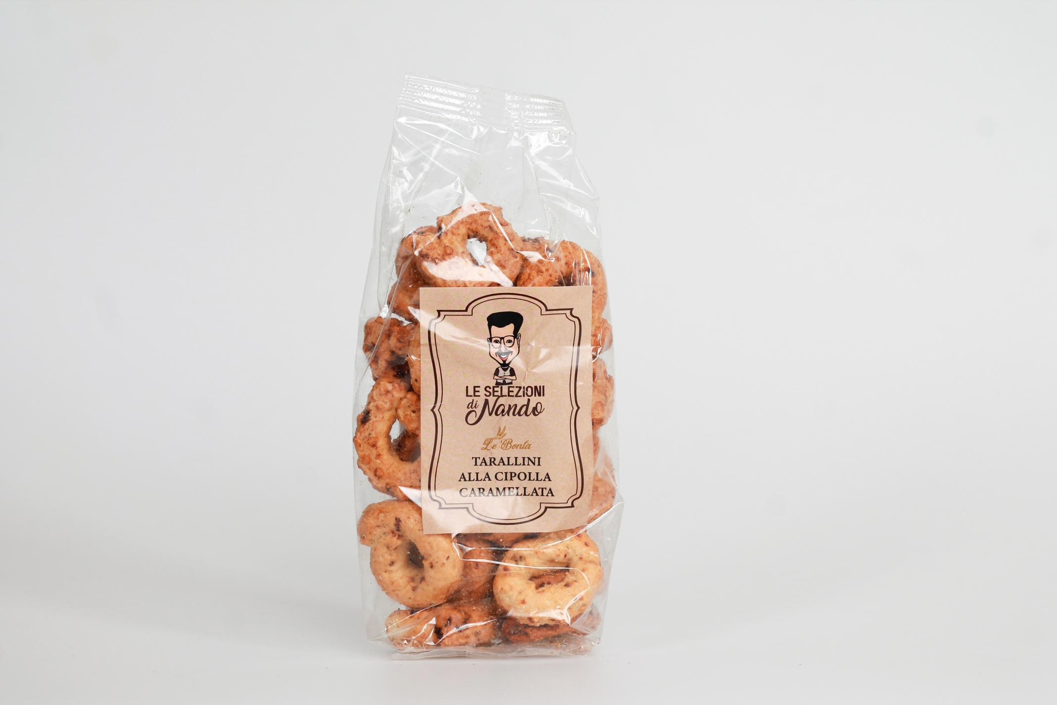 Dal gusto dolce e intenso, questi tarallini alla cipolla caramellata sorprendono con un sapore unico e avvolgente. Ottimi da soli o in abbinamento a un calice di vino bianco aromatico. Ingredienti: farina di grano tenero0,olio di oliva,vino bianco(contiene solfiti)olio di palma, malto di grano,uva sultanina,cipolla essiccata.